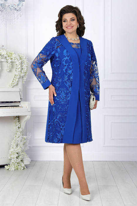 Платье женское полуприлегающего силуэта, расширенное к низу, длиной по среднему шву спинки 103 см. Перед с фигурной кокеткой из гипюра, идущей от середины левого плеча и уходящей в правую пройму, с декоративной деталью по правой стороне, идущей от кокетки вниз до линии талии. Декоративная деталь 2-х слойная: верхний слой из гипюра, нижний из трикотажной подкладки. Перед с нагрудными вытачками, идущими: левая- из проймы, правая от декоративной детали. Спинка с талиевыми вытачками, со средним швом, в верхней части которого обработана застежка на потайную тесьму-«молния». Горловина спинки округлая, обтачная. Горловина переда округлая, углубленная, срез обработан на плоскошовной машине. Рукава втачные, одношовные. Длина рукавов 21 см.