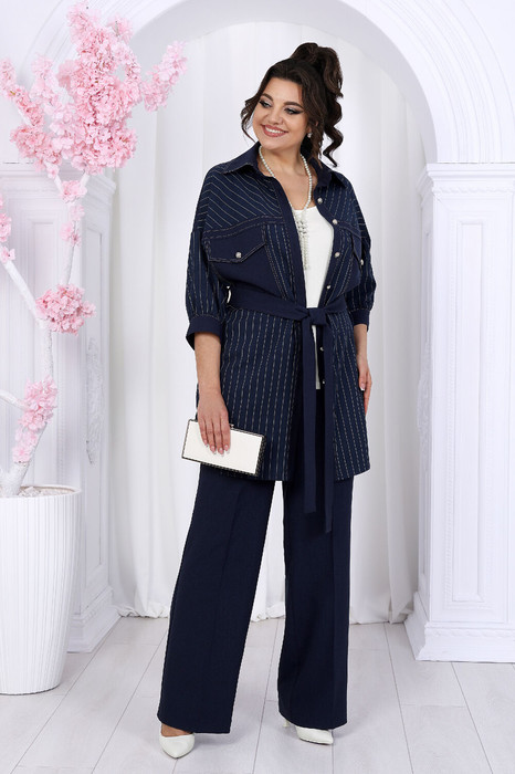 Брюки классические длинные, прямого силуэта, с посадкой на талии, выполнены из ткани «лен-вишер». Модель со стрелками, с центральной застёжкой на тесьму-«молнию», на притачном поясе, застегивающемся на петлю и пуговицу. Передние и задние половинки брюк с талиевыми вытачками, направленными от пояса вниз. Спереди обработаны боковые наклонные карманы. Для лучшего прилегания брюк в области талии в поясе по задним половинкам вставлена эластичная лента. Длина брюк по боковому (с поясом) - 107 см (50-52 р-р), 108 см (54-58 р-р).