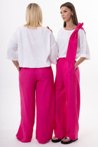 Брюки классические, длинные, прямого силуэта, с посадкой на талии, выполнены из ткани «крэш-вискоза». Модель без стрелок, с центральной застёжкой на тесьму-«молнию», на притачном поясе, застегивающемся на петлю и пуговицу. Спереди обработаны наклонные боковые карманы. Передние и задние половинки брюк с талиевыми вытачками, направленными от пояса вниз. Для лучшего прилегания брюк в области талии в поясе по задним половинкам вставлена эластичная лента. Длина брюк по боковому (с поясом) --107 см (50-52 р-р), 108 см (54-58 р-р).