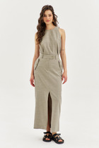Брюки классические, длинные, прямого силуэта, с посадкой на талии, выполнены из ткани «крэш-вискоза». Модель без стрелок, с центральной застёжкой на тесьму-«молнию», на притачном поясе, застегивающемся на петлю и пуговицу. Спереди обработаны наклонные боковые карманы. Передние и задние половинки брюк с талиевыми вытачками, направленными от пояса вниз. Для лучшего прилегания брюк в области талии в поясе по задним половинкам вставлена эластичная лента. Длина брюк по боковому (с поясом) --107 см (50-52 р-р), 108 см (54-58 р-р).