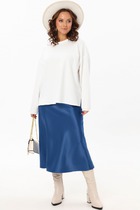 Блузка с асимметричной деталью по линии талии — это модный акцент, который визуально формирует стройный силуэт и придаёт образу дизайнерскую изысканность. Нежная линия декольте в обрамлении округлой горловины элегантно подчёркивает женственность.