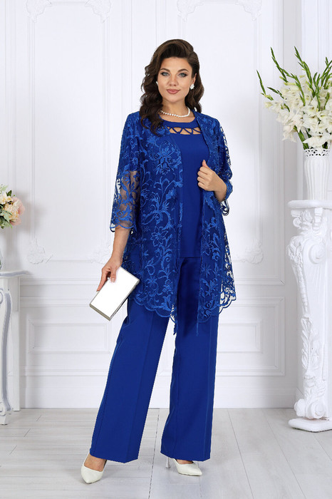 Комплект состоит из трёх предметов: изысканного кардигана из гипюра, мягкой трикотажной блузки и классических брюк со стрелками. Такой ансамбль выглядит нарядно, подчеркивает женственность и формирует правильный силуэт даже для фигур plus size.