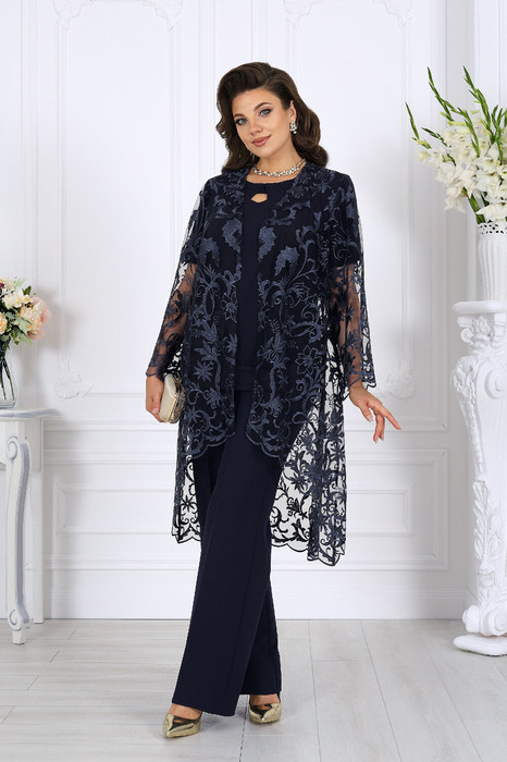 Воздушный гипюровый кардиган прямого силуэта с удлинённой спинкой и фигурными фестонами по краю создаёт лёгкость и утончённость образа. Полуприлегающая блузка из эластичного трикотажа «масло» мягко повторяет линии фигуры, не сковывая движения. Классические прямые брюки из костюмно-плательной ткани со стрелками визуально вытягивают силуэт, формируя изящные пропорции и обеспечивая комфорт в течение всего дня.