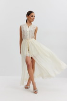 Блузка прямого силуэта, выполнена из вискозного «крэш»-полотна. Модель с втачным рукавом и плечевыми накладками. Спинка блузки со средним швом и рельефами, направленными от пройм до низа. Перед с центральной застежкой на 5 петель и 5 пуговиц. По переду блузки выполнены отлетные детали, которые входят в боковой шов и частично в пройму и вытачку. Отлетные детали переда идут к центру в виде треугольника, на левой детали обработан цельнокроенный пояс, в правой полукольца. Горловина оформлена отложным воротником. Рукав втачной короткий. Длина блузки – 66 см (50-58 р-р); длина рукава – 22 см (50-58 р-р).