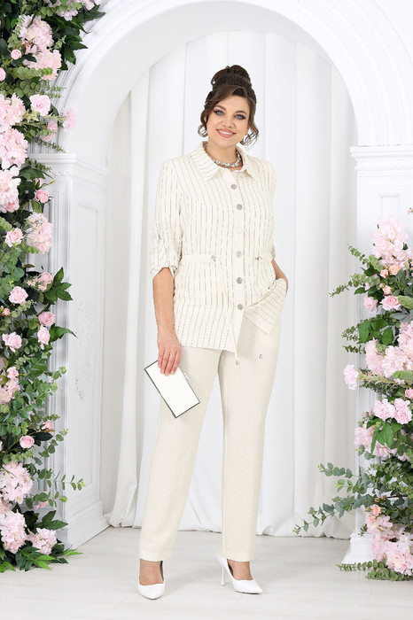Комплект брючный 3-х предметный, состоящий из жакета, брюк и джемпера. Жакет выполнен из костюмно-плательной ткани лён полоска, брюки выполнены из костюмно-плательной ткани лён однотон, джемпер выполненный из трикотажного полотна.
