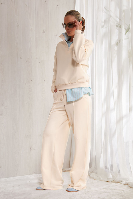 Костюм, выполнен из премиального трикотажного полотна, состоящий  из свитшота и брюк. Свитшот  прямого силуэта, перед и спинка изделия прямые, спущенная линия  плеча. Горловина - высокая стойка  на молнии. Низ рукава и низ изделия на притачной манжете. Лого на полочке изделия. Брюки свободного кроя на резинке. Карманы в  боковых швах.   Передние и задниеполовинки брюк  с застроченными кантами. По поясу вставлен декоративный шнурок.