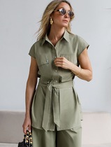 Элегантный комплект, состоящий из брюк и рубашки. Рубашка прямого силуэта, умеренная по объему, длиной до середины бедер. Центральная бортовая застежка на петли и пуговицы. Воротник рубашечный. Спущенная линия плеча. Свободный короткий рукав. Спинка прямая. Изделие без подкладки. Брюки прямые, свободного кроя, без подкладки. Пояс на резинке (без застежки). Карманы в боковых швах.