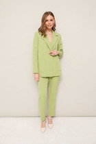 Жакет-блейзер прилегающего силуэта. Длиной до линии бедер. Центральная бортовая застежка на петли и пуговицы. Спереди рельефы и клапаны. Спинка прямая, со средним швом и рельефами. Рукав втачной, длинный. Воротник стояче-отложной. Изделие без подкладки.