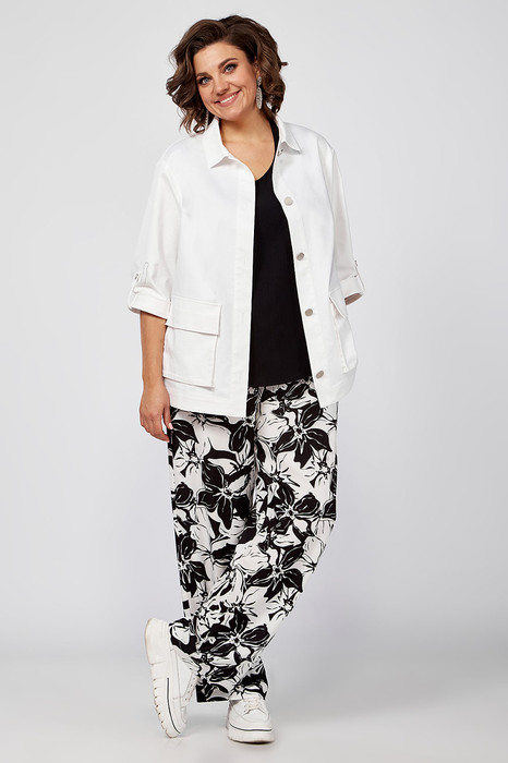 Стильный, современный, трендовый комплект с брюками для повседневной носки, торжественного мероприятия, в офис, школу или на прогулку. Приобретая один комплект, Вы покупаете несколько образов, каждая единица которого универсальна, поэтому может сочетаться со многими вещами из Вашего гардероба. Стильный вариант для красивого женского образа – сочетание белого джинсового жакета с брюками "бананами" из принтованной ткани и контрастной майкой. Жакет-куртка прямого кроя с рельефными швами и кокетками по переду и спинке, накладные карманы с клапанами и декоративные металлизированные пуговицы -  узнаваемые нотки вневременной джинсовой мелодии. В рукавах предусмотрены паты с пуговицей, что позволяет сделать рукава короче. Жакет просто необходим при создании как романтического, так и спортивного образа. Майка с рукавом «крылышко», горловина углубленная V-образной формы. Брюки "бананы" с боковыми карманами и поясом частично на резинке. Не упустите возможность приобрести брючный комплект с большим выбором размеров и ощутить комфорт в носке качественной и стильной одежды!