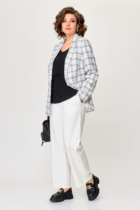 Представьте себе величественную даму, идущую с изяществом и уверенностью, восхищающую всех своим непринужденным стилем. Её образ – это искусное сплетение элегантности и современной роскоши. На ней – женский брючный костюм, созданный для того, чтобы притягивать восхищенные взгляды. Пиджак, в котором она словно воплощает элегантность и власть, олицетворяет роскошь и стиль. Он выглядит как произведение искусства: однобортный, с центральной застёжкой на две изысканные пуговицы, создающие ощущение истинного роскошного шика. Отложной воротник с лацканом придает образу особый шарм и респектабельность. Спинка и перед пиджака украшены изысканными рельефами, которые подчеркивают женственные линии фигуры. Прорезные карманы в листочку дополняют его стиль и функциональность, а подкладка добавляет ощущение роскоши и комфорта. Брюки, с другой стороны, придают образу современную строгость и изысканность. Прямой покрой создает идеальные линии, подчеркивая изящную фигуру. Они выполнены из однотонной ткани, которая великолепно гармонирует с клетчатым пиджаком. Брюки с боковыми карманами добавляют удобство и практичность, а пояс на резинке обеспечивает комфорт. Этот брючный костюм – это не просто одежда, это произведение искусства, которое подчеркивает индивидуальность и утонченный вкус своей обладательницы. Он создан для того, чтобы притягивать восхищенные взгляды и оставаться в памяти как воплощение элегантности и стиля.