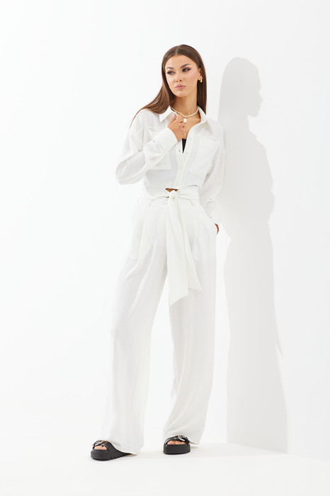 Брюки прямые, свободные. Верхний срез обработан поясом, застегивающимся на одну петлю и пуговицу. На поясе шлевки. В боковых швах карманы-клапаны. Передняя половинка брюк с двумя односторонними складками. Задние полотнища с талевыми вытачками.