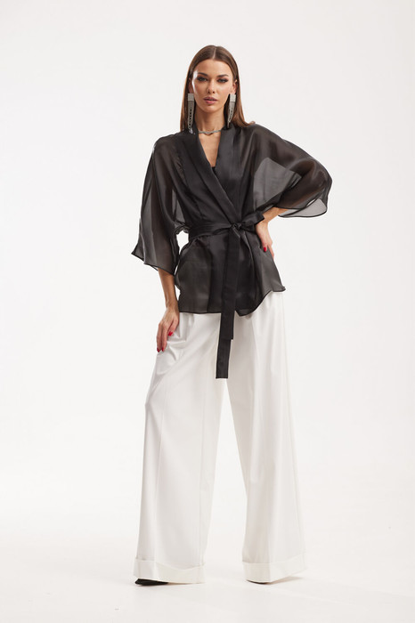 Блуза выполнена из воздушной прозрачной ткани - «органзы». Блуза свободной формы, прямого силуэта с цельнокроеным рукавом. Спинка цельная с воротником «шаль» переходящая в двубортную застежку на запах, фиксирующуюся поясом. Рукав длиной до уровня локтя.