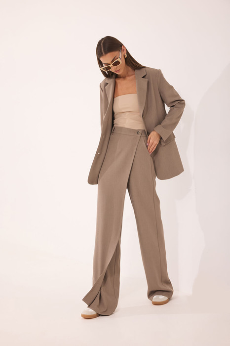 Брюки свободной формы, спереди с запахом. Запах выполнен из правого бокового шва и пристегивается на петли-пуговицы на поясе. Возможно носить не застегивая, виде драпировки по правой боковой части. Верхний срез брюк обработан поясом, по спинке вставлена резинка. Застежка на молнию и в поясе – петля-пуговица. В боковых швах передних половинок расположены наклонные карманы. По передним половинкам и запахе – шлевки.