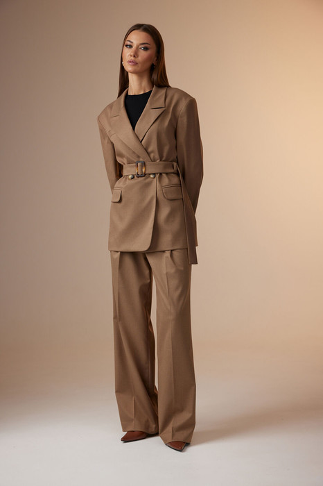 Комплект женский, состоящий из жакета и брюк, с поясом из основной ткани с декоративной пряжкой.
