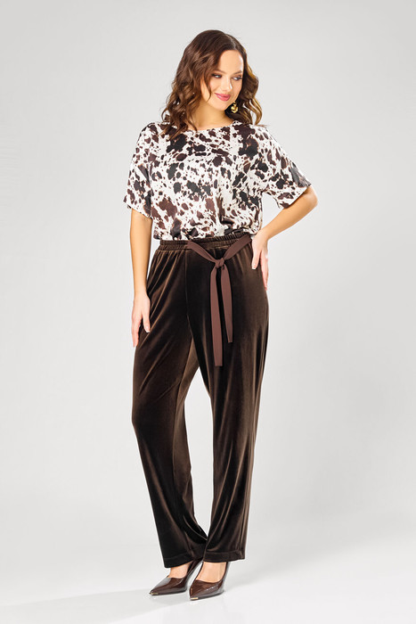 Комплект повседневный из бархатного полотна.Брюки заужены к низу, на поясе. Пояс на резинке, слева завязка из отделочной ткани. Карманы в боковых швах. Блузка с округлям вырезом горловины, со спущенным коротким рукавом.