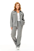 Жакет полуприлегающего силуэта, с пиджачным воротником, застежка на две пуговицы. На полочке шлицы  с декоративными шлицами. Спинка со средним швом. Рукав втачной, длиной три четверти, регулируется патой. Брюки прямые, пояс на резинке, карманы в боковых швах.