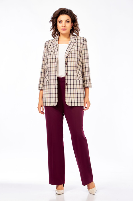 Комплект выполнен из двух тканей. Жакет в клетку, брюки однотон. Жакет полуприлегающего силуэта, с застежкой на три пуговицы. Воротник с лацканами, по переду карманы с листочкой, рельефные швы. Спинка со средним швом. Жакет на подкладке. Рукав длиной три четверти с цельнокроеной манжетой. Брюки прямого кроя со стрелками. Брюки на поясе по спинке резинка, застежка на молнию и петлю-пуговицу.