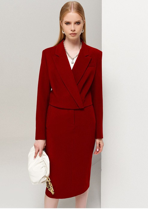 Элегантный офисный костюм послужит вам для создания стильных образов. Его уместно надеть на работу, учебу, деловую встречу, конференцию, бизнес-ланч. Модель изготовлена из плотной поливискозной ткани. Укороченный жакет и юбка-карандаш длиной ниже колена скроены в прямом силуэте, отлично садятся по фигуре. Пиджак с английским воротником и нагрудным карманом подчеркивает официальный стиль комплекта. Юбка с молнией в гульфике дополнена карманами-обманками.