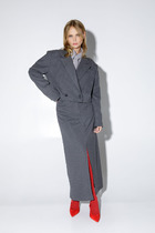 Длина жакета по спинке около 66 см в размерах 40-46 и около 69 см в размерах 48-52, длина рукавов около 61 см. Длина брюк по боковому шву с поясом около 97 в размерах 40-46 и около 98,5 см в размерах 48-52, длина по внутреннему шву около 70 см.