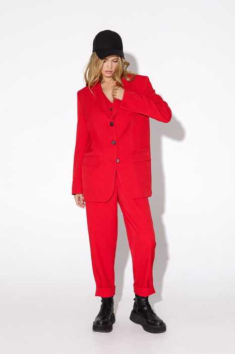 Длина жакета по спинке около 72 см в размерах 40-46 и около 74 см в размерах 48-52, длина рукавов около 62,5 см. Длина брюк по боковому шву с поясом около 99 см в размерах 40-46 и около 100,5 см в размерах 48-52, длина по внутреннему шву около 69,5 см.