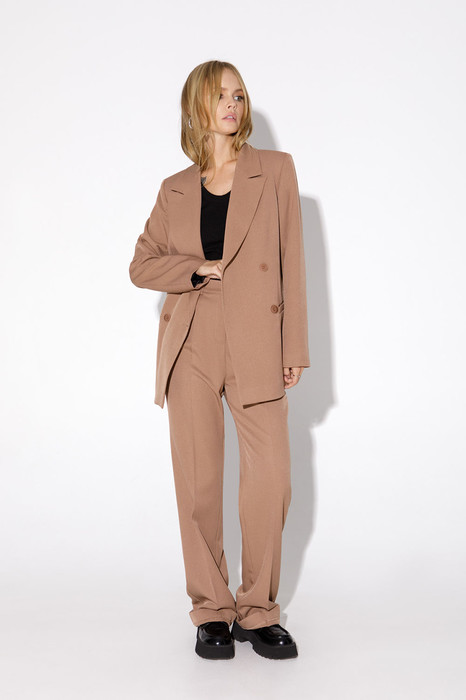 Текстильный костюм-двойка из двубортного оверсайз жакета и прямых брюк с высокой посадкой. Детали: жакет прямого силуэта, пиджачный воротник, прорезные карманы, спинка со средним швом, втачные двухшовные рукава, жакет на подкладке. Брюки на притачном поясе со шлевками, передние половины с небольшими мягкими складками и заутюженными стрелками, застежка на молнию и пуговицу, боковые карманы.