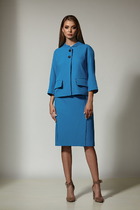 Длина жакета по спинке около 69 см в размерах 40-46 и около 72 см в размерах 48-52, длина рукавов около 62 см. Длина брюк по боковому шву с поясом около 112,5 в размерах 40-46 и около 114 см в размерах 48-52, длина по внутреннему шву около 80 см.