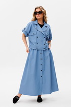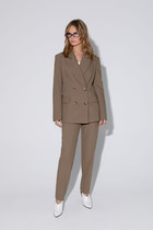 Длина жакета по спинке около 69 см в размерах 40-46 и около 72 см в размерах 48-52, длина рукавов около 62 см. Длина брюк по боковому шву с поясом около 113 см в размерах 40-46 и около 114,5 см в размерах 48-52, длина по внутреннему шву около 82 см.