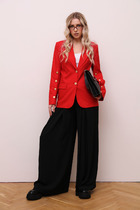 Костюм-двойка из оверсайз жакета с расширенной линией плеч и прямых брюк-палаццо со стрелками. Детали: жакет прямого силуэта, пиджачный воротник, перед с прорезными функциональными карманами, однобортная застежка на петли и пуговицы, спинка со средним швом и шлицей, рукава втачные двухшовные, жакет на подкладке. Брюки с высокой посадкой на притачном поясе со шлевками, застежка на молнию и пуговицу, боковые карманы, передние половины с заутюженными стрелками и двумя небольшими складками.