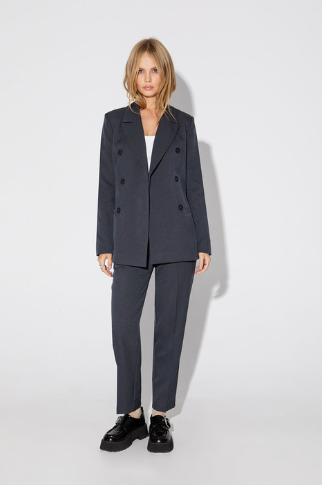 Классический костюм-двойка из двубортного жакета и укороченных брюк со стрелками.