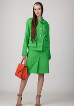 Детали: жакет прямого силуэта, расширенная линия плеч, пиджачный воротник, перед с прорезными функциональными карманами, однобортная застежка на петли и пуговицы, спинка со средним швом и шлицей, рукава втачные двухшовные, жакет на подкладке. Юбка с высокой посадкой, притачной пояс, талиевые вытачки, застежка сзади на потайную молнию, юбка на подкладке.