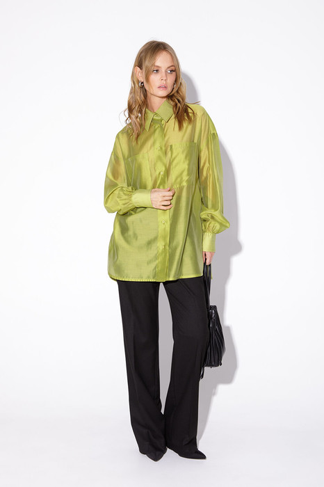 Текстильный комплект-двойка из полупрозрачной оверсайз рубашки и прямых широких брюк со стрелками.