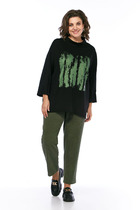 Длина жакета по спинке около 68,5 в размерах 40-46 и около 71,5 см в размерах 48-52, длина рукавов около 63 см. Длина брюк по боковому шву с поясом около 114 см в размерах 40-46 и около 115,5 см в размерах 48-52. Длина по внутреннему шву около 83 см