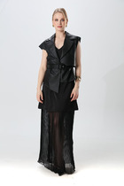 Детали: жакет полуприлегающего силуэта, рельефы, пиджачный воротник, застежка на две петли и пуговицы, функциональные карманы, жакет на подкладке. Жакет также можно зашнуровать по бокам. Брюки с притачным поясом со шлевками, передние половины с небольшими застроченными мягкими складками и заутюженными стрелками, застежка на молнию и пуговицу, боковые карманы. Задние части брюк с вытачками и заутюженными стрелками. Пояс брюк прямой, без резинки.