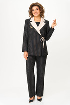 Детали: жакет прямого силуэта, пиджачный воротник, перед с прорезными функциональными карманами, нагрудный декоративный карман, однобортная застежка на петли и пуговицы, спинка со средним швом, рукава втачные двухшовные со шлицами, жакет на подкладке. Брюки с высокой посадкой, притачной пояс с резинкой и шнурами, без застежки, боковые карманы, передние части брюк с глубокой складкой у пояса.