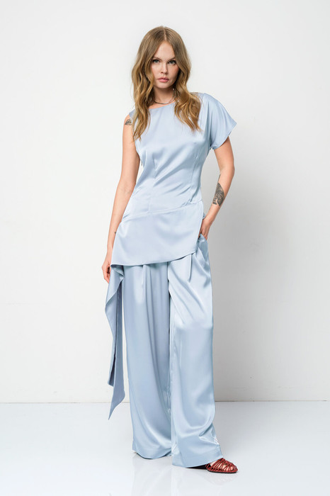 Атласный костюм-двойка из приталенной асимметричной блузы и широких брюк.