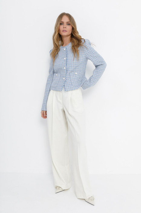 Костюм-двойка из укороченного жакета из фактурной ткани в стиле «шанель» и брюк-палаццо.