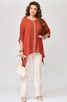 Детали: поло прямого силуэта, свободный покрой, спущенная линия плеча, потайная застежка на петли и пуговицы, длинные рукава. Широкие брюки-палаццо с небольшими складками у пояса и заутюженными стрелками, притачной пояс со шлевками, застежка на молнию и пуговицу, боковые карманы. Задние части брюк с вытачками и имитацией карманов.