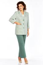 Длина жакета по спинке около 69 см в размерах 40-46 и около 72 см в размерах 48-52, длина рукавов около 62 см. Длина брюк по боковому шву с поясом около 113 см в размерах 40-46 и около 114,5 см в размерах 48-52, длина по внутреннему шву около 82 см.