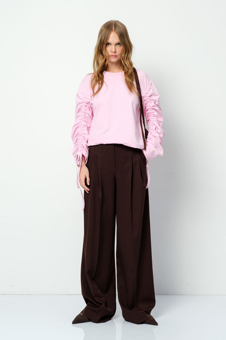 Комплект-двойка из трикотажного свободного свитшота с объемными рукавами и брюк-палаццо из текстильной ткани.