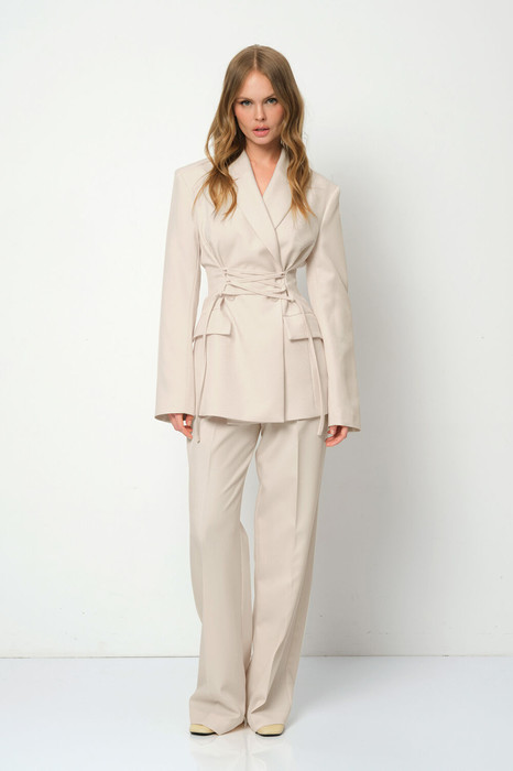 Костюм-двойка из жакета со шнуровкой и широких прямых брюк.