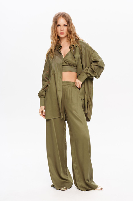 Костюм-тройка из свободной рубашки, топа и широких брюк на резинке.