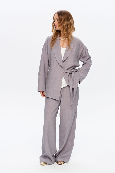 Костюм-двойка из свободной блузы с шалевым воротником и широких брюк из фактурной вискозы.