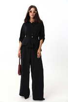 Костюм-двойка из свободной блузы и широких брюк с высокими разрезами.