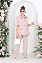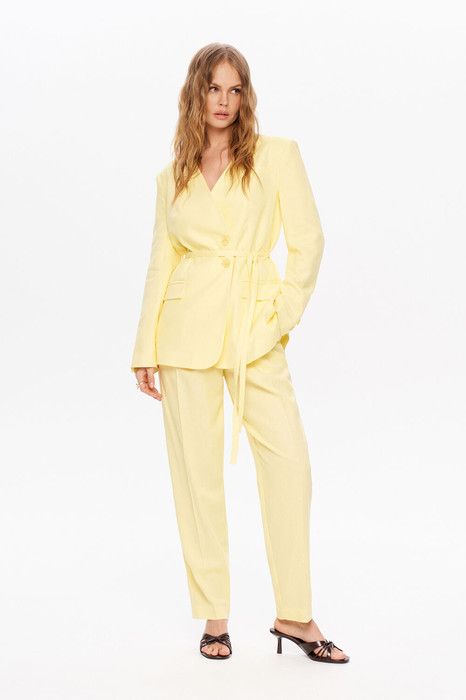 Детали: жакет полуприлегающего силуэта, перед с талиевыми вытачками, отрезные бочки переда и спинки, спинка с рельефами, функциональные карманы, смещенная застежка на петли и пуговицы, рукава втачные длинные с фигурной шлицей, съемный пояс, жакет на подкладке 100% хлопок. Брюки с высокой посадкой, притачной пояс с резинкой и шнурами, без застежки, боковые карманы, передние части брюк со складками у пояса.