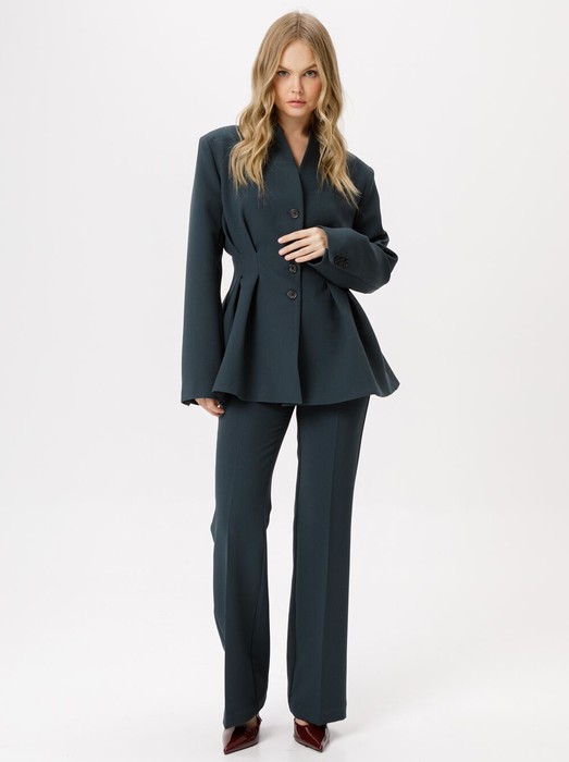 Костюм-двойка из приталенного жакета со складками и брюк-клеш со стрелками.