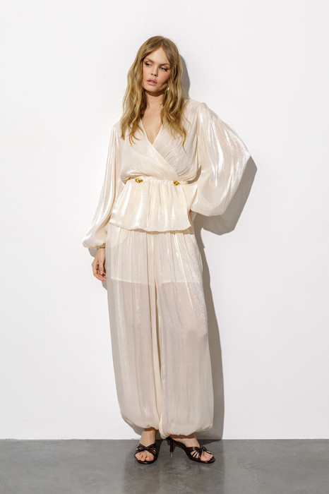 Костюм-двойка из блузы и широких свободных брюк-алладинов из фактурного шифона.
