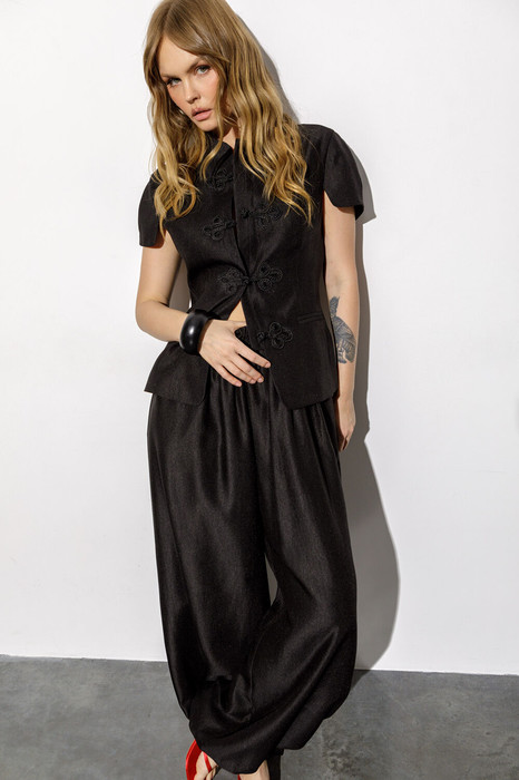 Комплект-двойка из приталенного жакета с коротким рукавом и широких брюк алладинов.