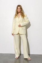 Костюм-двойка из оверсайз жакета с расширенной линией плеч и прямых широких брюк со стрелками.