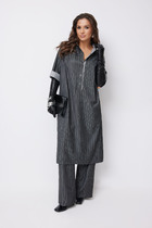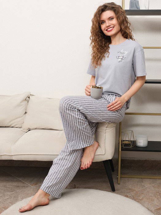 Костюм молодежный из трикотажного полотна «кулирка» в комбинации двух видов: с набивным рисунком и гладкокрашенного в единой цветовой гамме, состоящий из футболки и брюк. Футболка - из гладкокрашенного полотна, классического покроя, с короткими втачными рукавами, горловиной овальной формы и принтом на полочке, выполненным в технике «шелкографии». Горловина обработана втачной планкой из основного материала. Брюки - из полотна с набивным рисунком, длинные, слегка расширенные книзу, с карманами в боковых швах, на притачном поясе с эластичной тесьмой внутри.