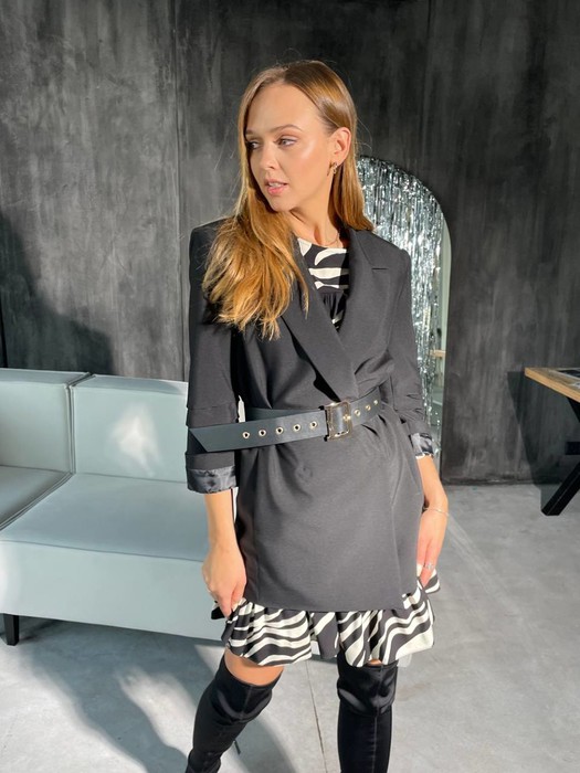 Жакет  прямого кроя, на подкладке, застегивается на потайную кнопку изнутри. На рукаве зафиксированные складки. Ремень в комплекте. Жакет 76 см, рукав 47 см. Платье 83 см.(свободный силуэт)